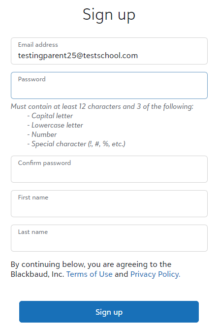 Username and Password: Please create Password, enter First and Last Name, and select Sign up.